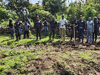 Abakozi ba SGF, RDB, n’inzego z’ibanze bafatanyije gusana urukuta rw’amabuye no gusibura umuferege, mu muganda bakoreye mu murenge wa Kinigi mu karere…